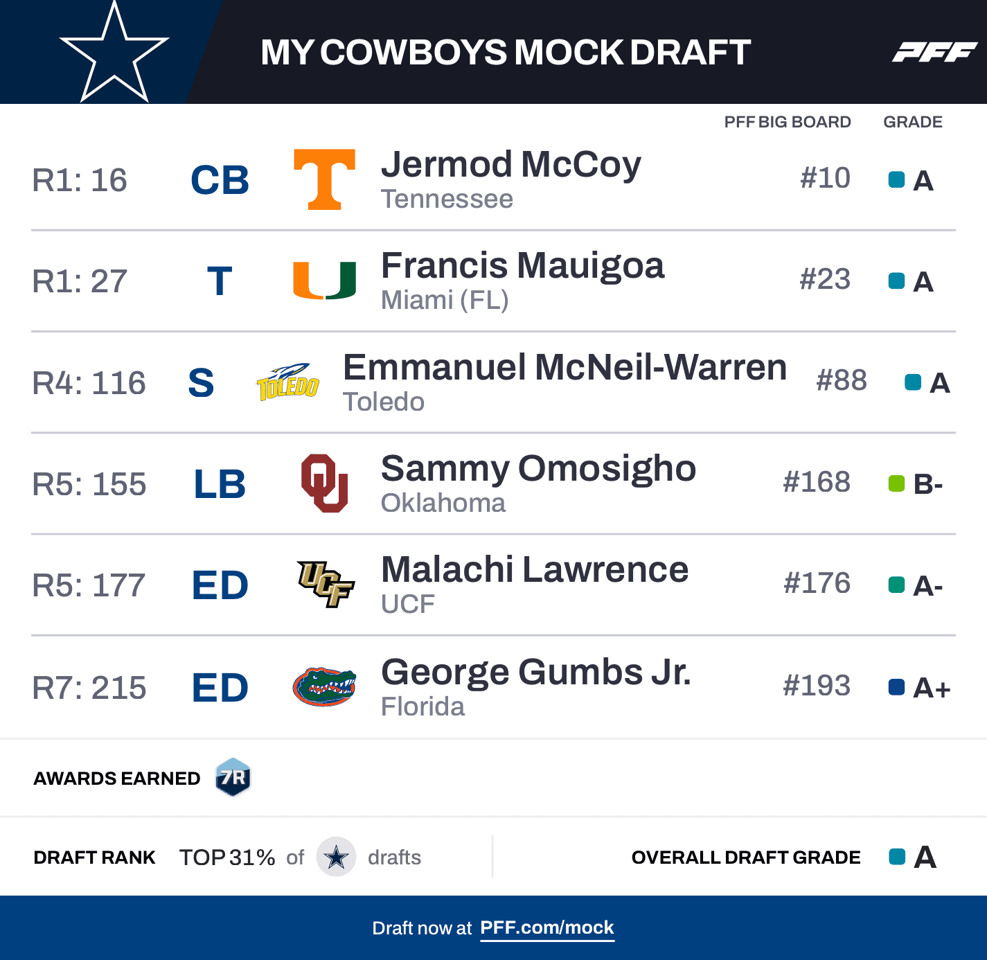 Both of these mocks earned A-level grades from PFF, but we know that doesn’t mean much, and they take the Cowboys in some different directions for the team.