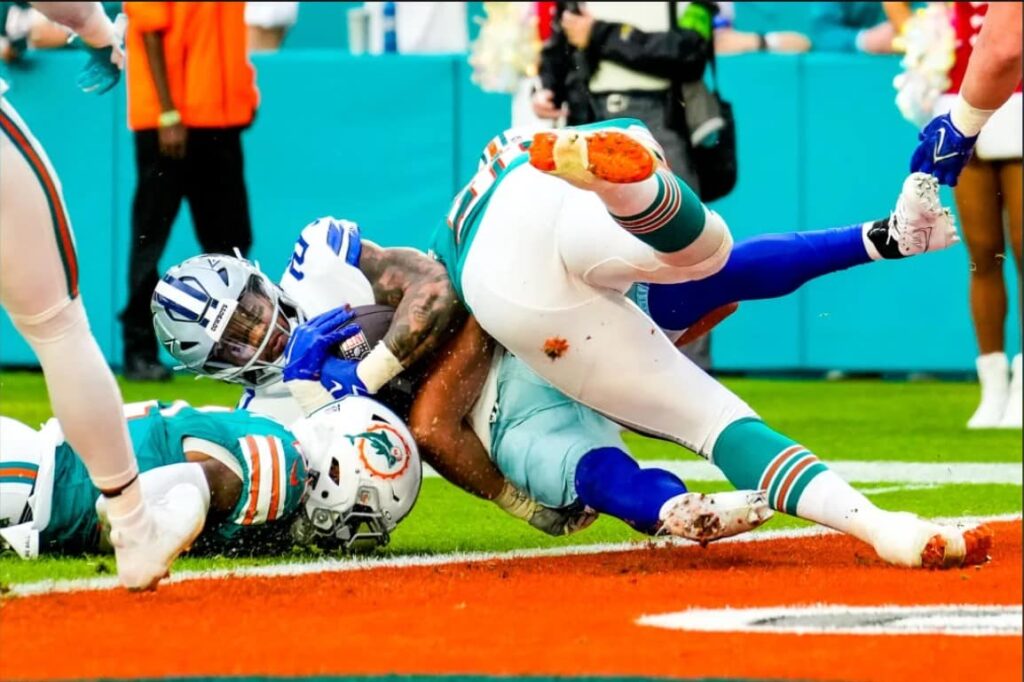 That penalty set up the Dolphins with a 1st & Goal from the Cowboys’ four yard line, and Tua Tagovailoa would throw a touchdown to Raheem Mostert to give Miami a 13-7 lead at the half.