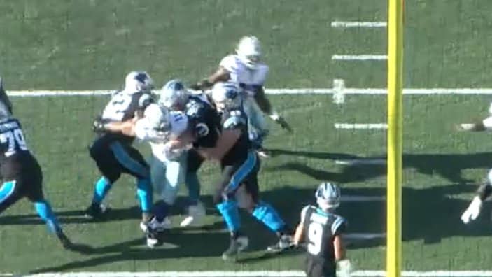 Take a look at this clip where he absolutely deleted two of the Panthers defenders at the same time to clear the way for Tony Pollard.