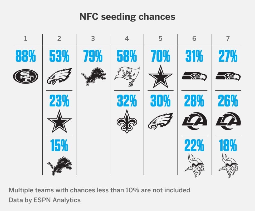 Again, each team winning their final three games would mean they would finish with identical 9-3 records against NFC opponents.