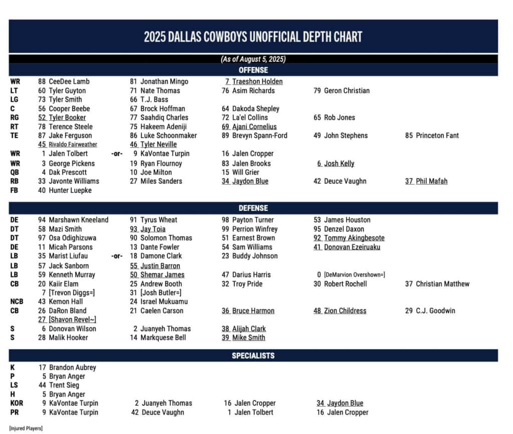As the Dallas Cowboys shared the practice field with the Los Angeles Rams this week before they both played their first preseason game against each other on Saturday, the Cowboys released their first unofficial depth chart.
