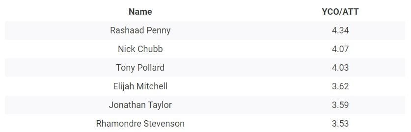 Something else that stands out about TP’s play is his propensity for slipping through contact and breaking tackles. He ranks third in yards after contact among all NFL running backs with at least 125 carries.